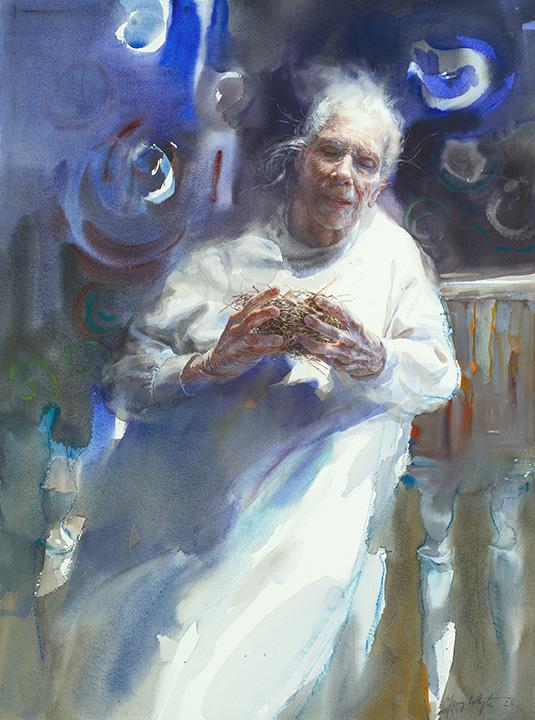 "Coming to Camelot, is of my neighbor, Dot, who is skipping past ninety-five years old. Inspired by her expressive hands and white hair, the painting is a nod to the pageantry and spirit of aging. Does Dot actually play the flute? No, but she sure has the playful quality of music.” Mary Whyte